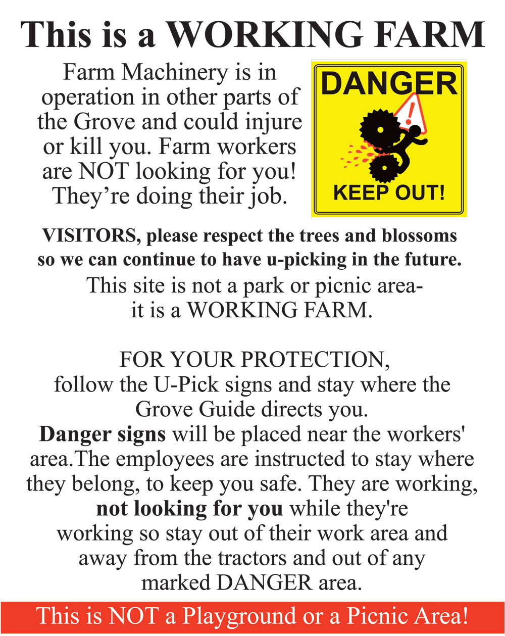 Gotta tell you what the State of Florida and the insurance company wants you to know… you’ll see this sign again, when you come to the Grove to U-Pick. It’s required by law.